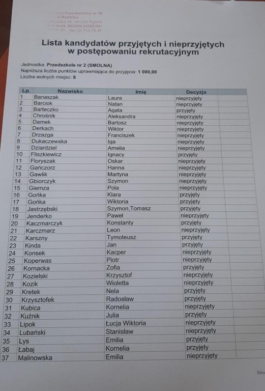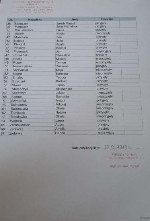 Lista dzieci przyjętych i nieprzyjętych w postępowaniu rekrutacyjnym.