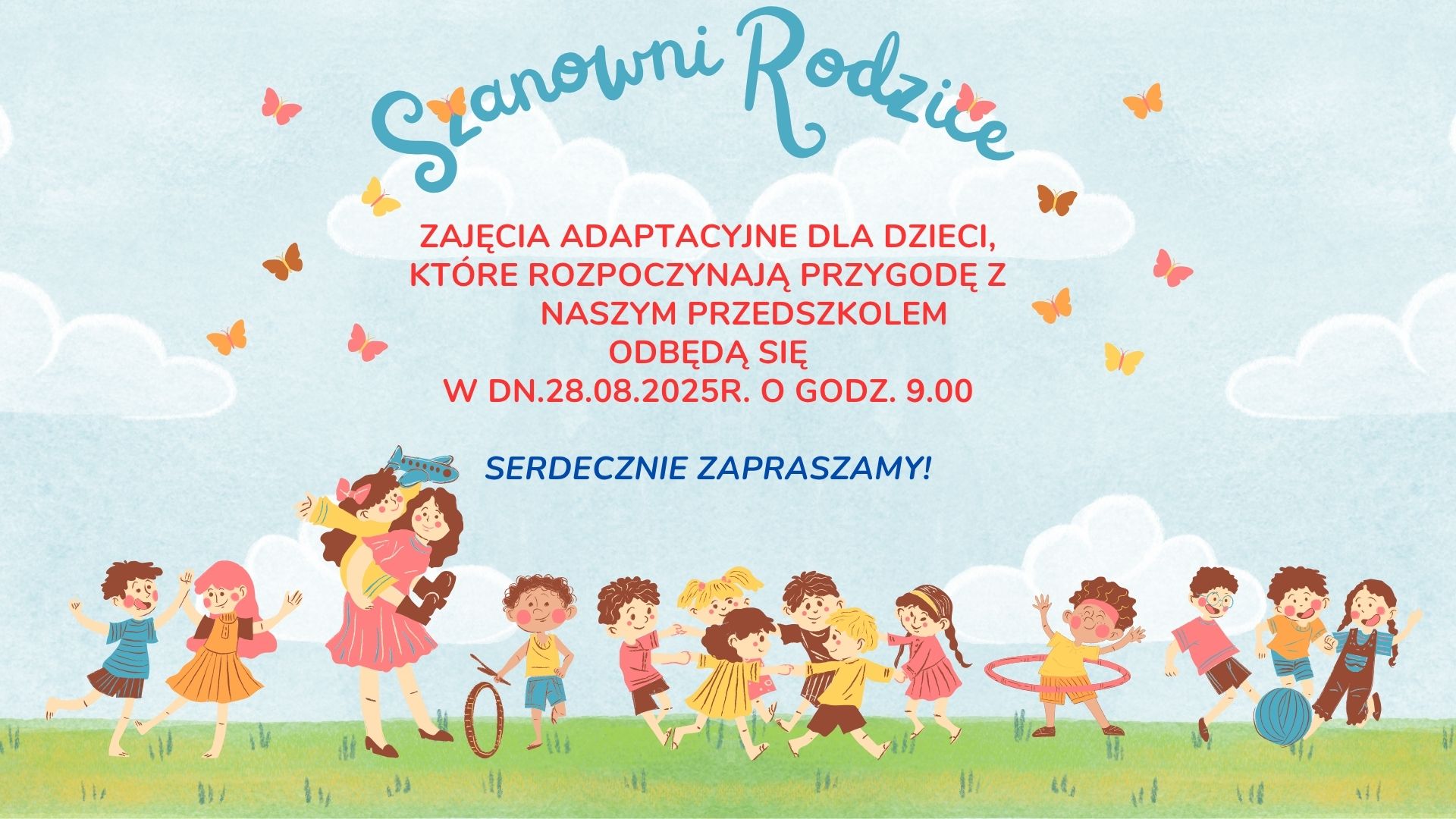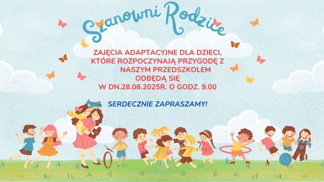 Zajęcia adaptacyjne dla dzieci, które rozpoczynają przygodę z naszym Przedszkolem odbędą się w dn. 28.08.2025r. o godz. 9.00.